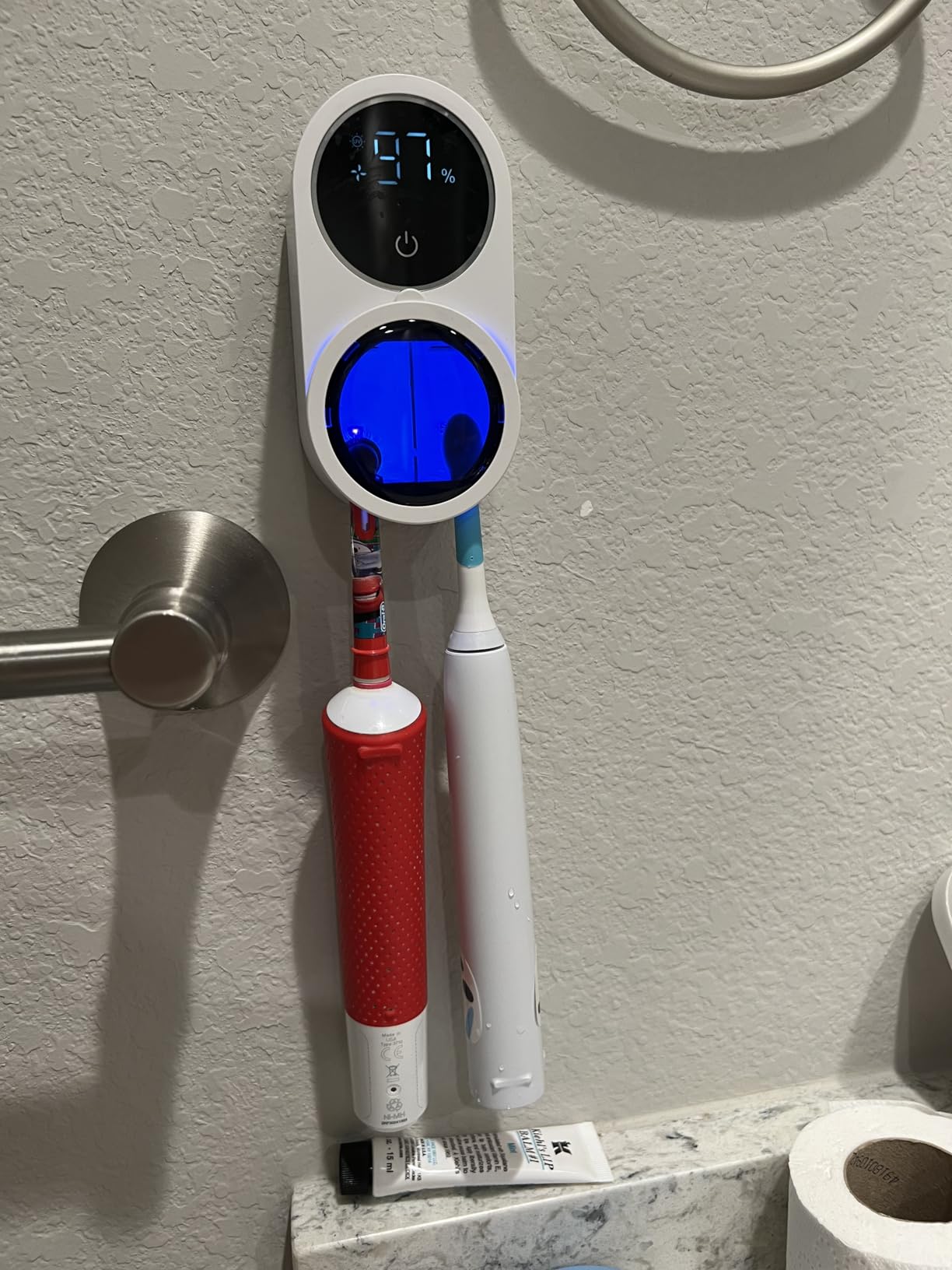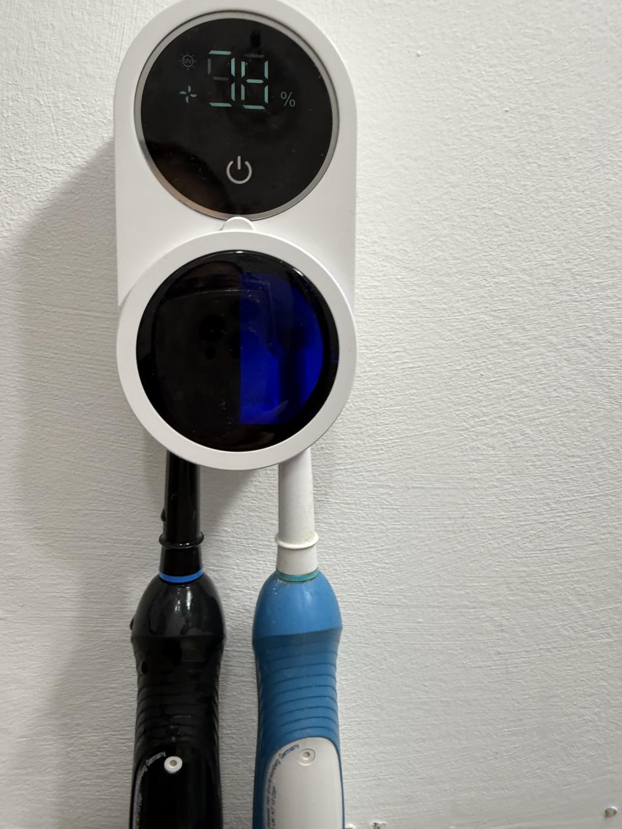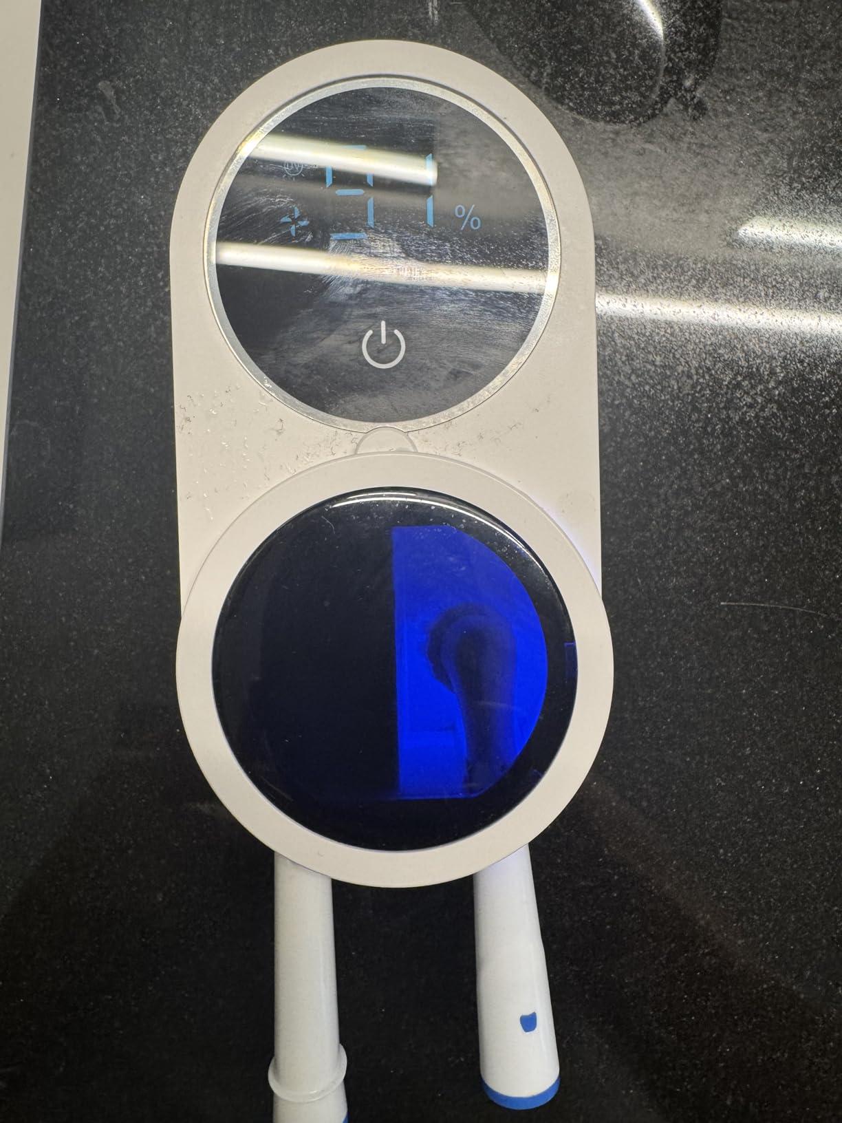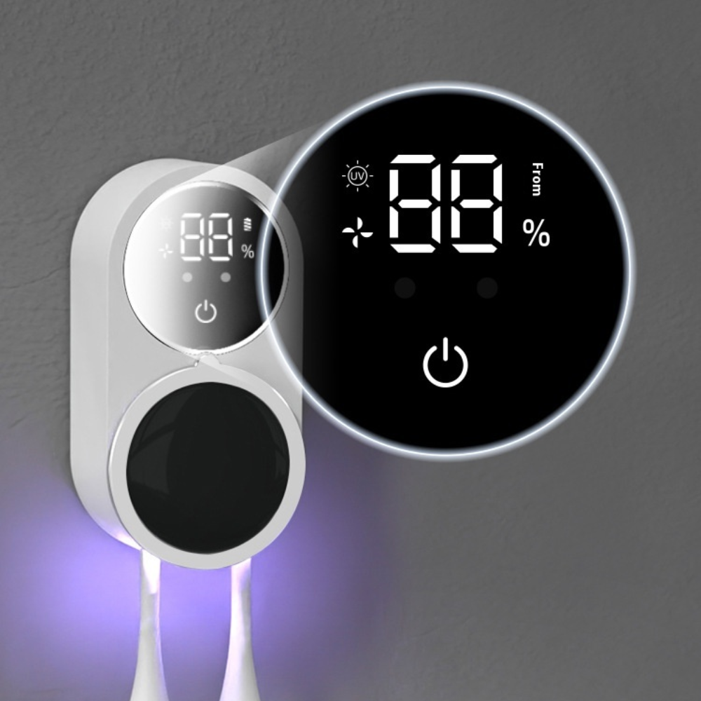 The sanitizer provides automatic cleaning and air-drying: it runs 24-hour operation to ensure the toothbrush dries completely after each use. Additionally, there is a LED smart screen to display status like battery, cleaning progress, and drying status.