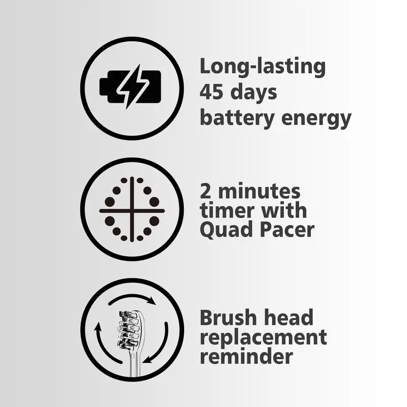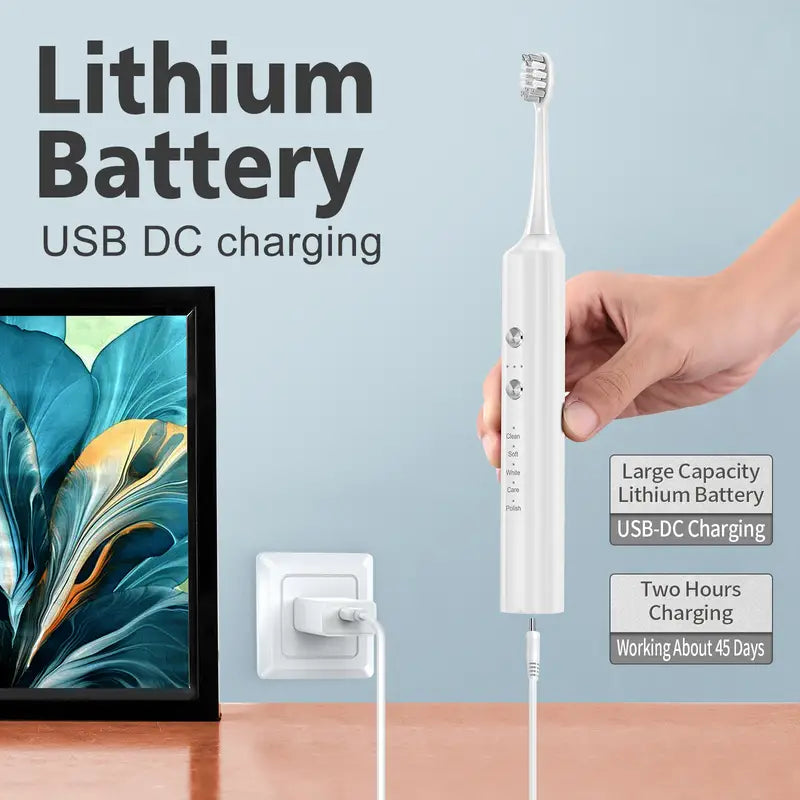 This advanced toothbrush features three interchangeable brush heads, ensuring a personalized cleaning experience tailored to your needs, operating for an astonishing 45 days on a single charge. Thanks to its efficient USB DC charging system, you can keep your toothbrush powered up and ready to go.
